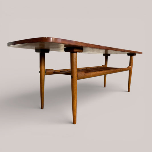 Mid-century teak coffee table with slatted magazine shelf