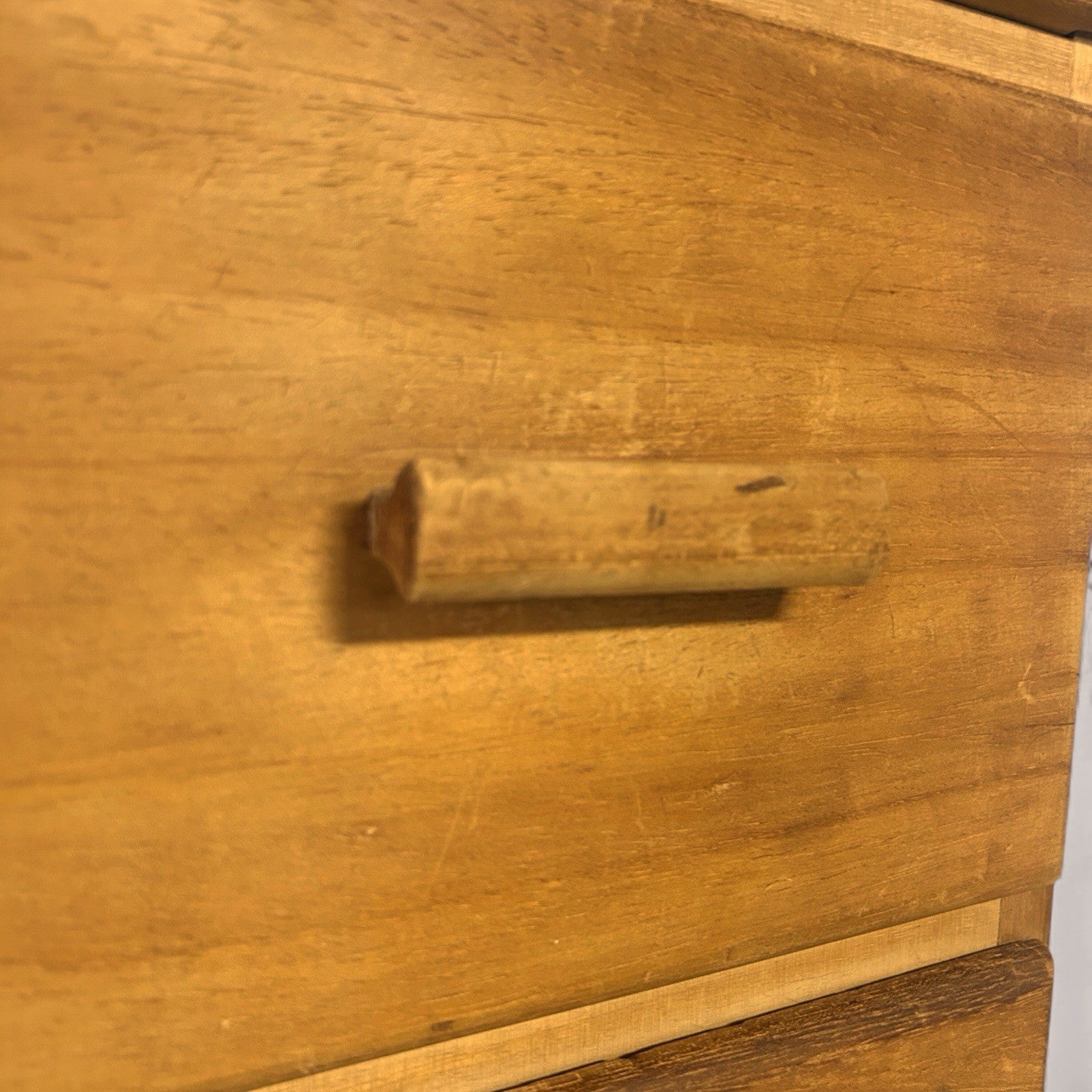 This no-nonsense style was common in schools, workshops and modest post-war homes. It’s built in solid pine with dovetail drawers and tapered plinth-style legs that lift the weight visually. The aged surface, marks and colour shifts give it that unmistakeable pre-1950s feel. Ideal for anyone who likes simple, well-made furniture without pretence.