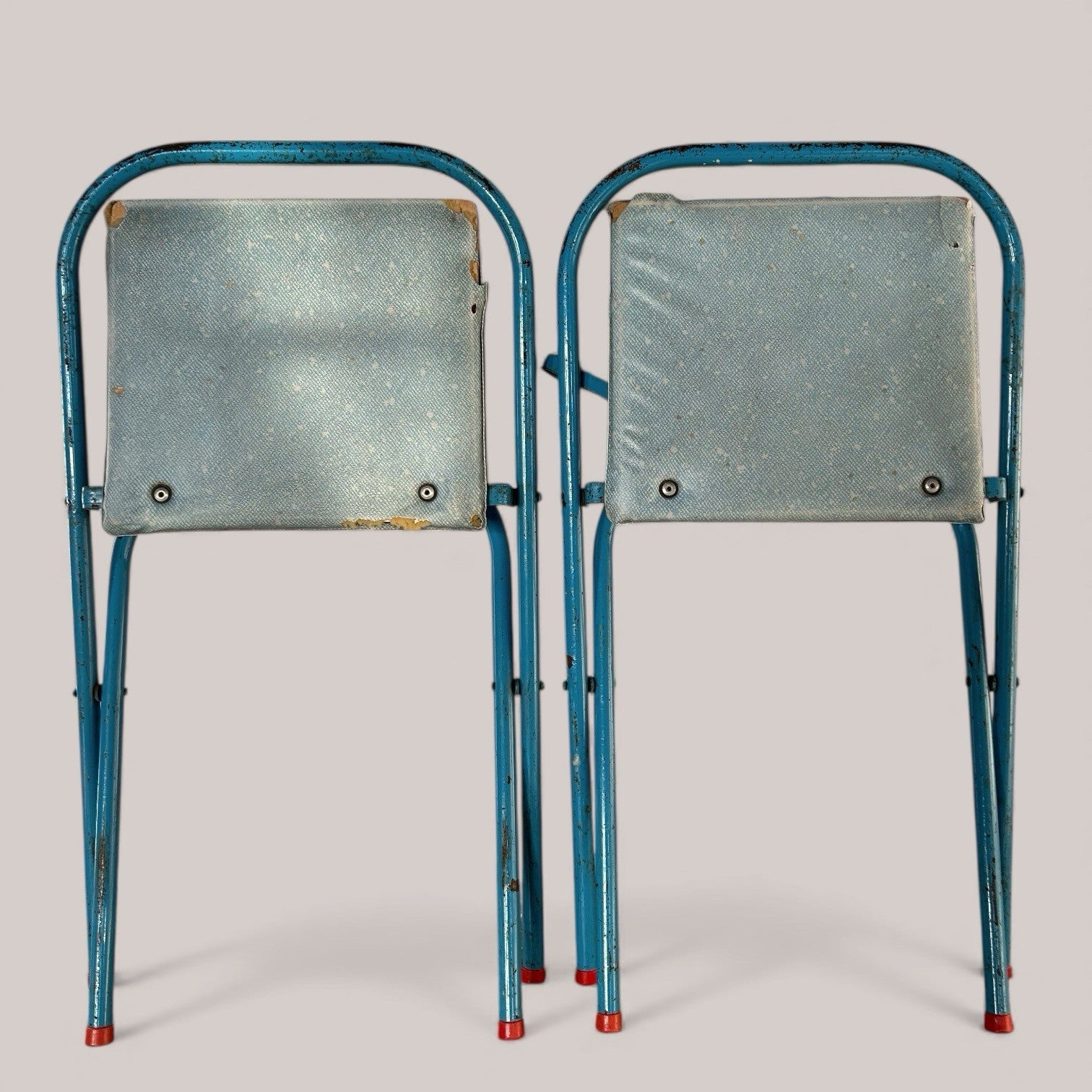 Charming 1960s children's school desk set with blue tubular steel frames and pine lift-top desk. Folding chair included (seat fabric worn). Full of vintage charm—great for playrooms, studios or display.