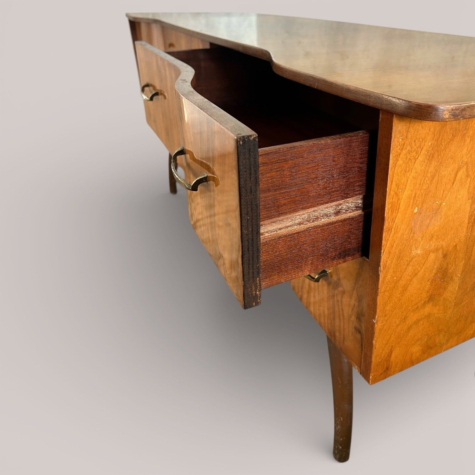 The piece is solid and has been checked over and cleaned. There are some veneer chips, most noticeably to the lower edge of the left-hand drawer, along with some UV fading to the top surface. These are cosmetic and consistent with age, and are reflected in the price. A good, usable mid-century piece.