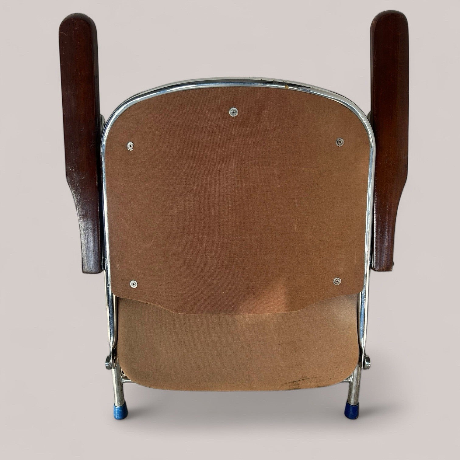 This style of chair was widely used in halls, community centres and studios throughout the 1970s and 80s. The chrome gives it a clean industrial edge, while the timber arms soften it visually. Great as a spare seat, desk chair, studio prop or for anyone who likes honest, functional design. Upholstery shows age and use, as expected for an original piece.