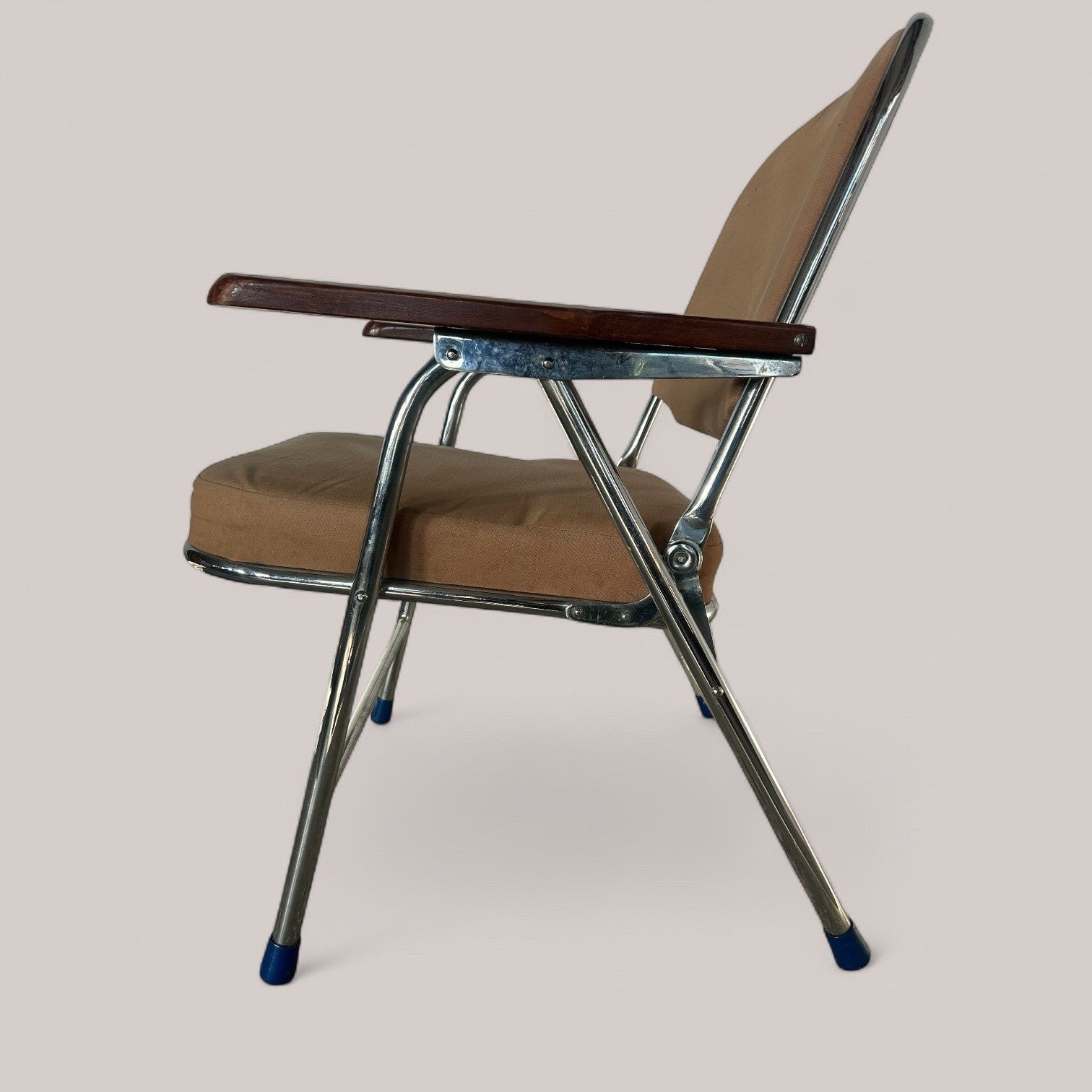 Vintage 1970s folding armchair with chrome frame, wooden armrests and original brown upholstery. A practical, lightweight chair with a relaxed shape and a proper mid-century utility feel. Folds neatly for storage and carries that lived-in, workshop-meets-retro charm.