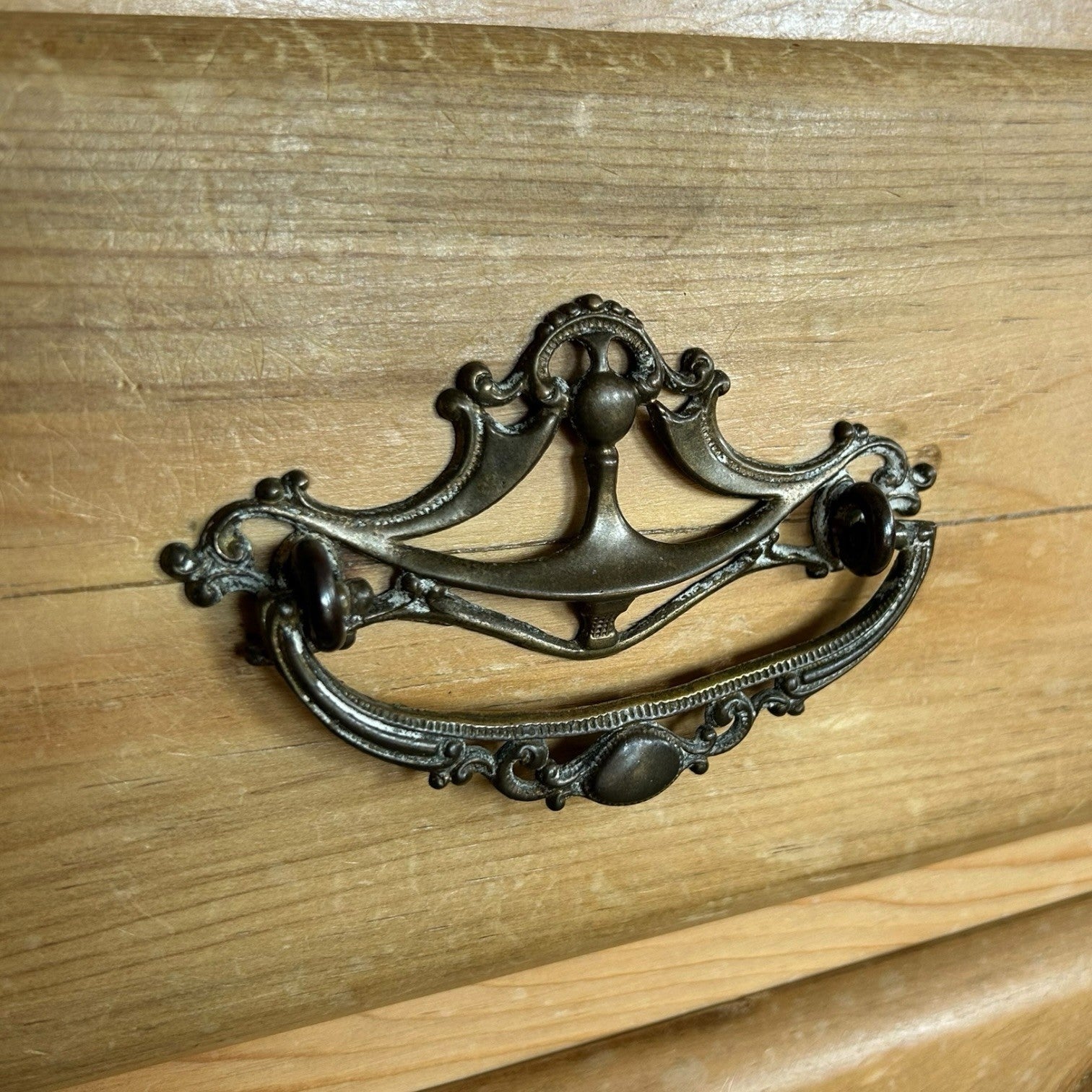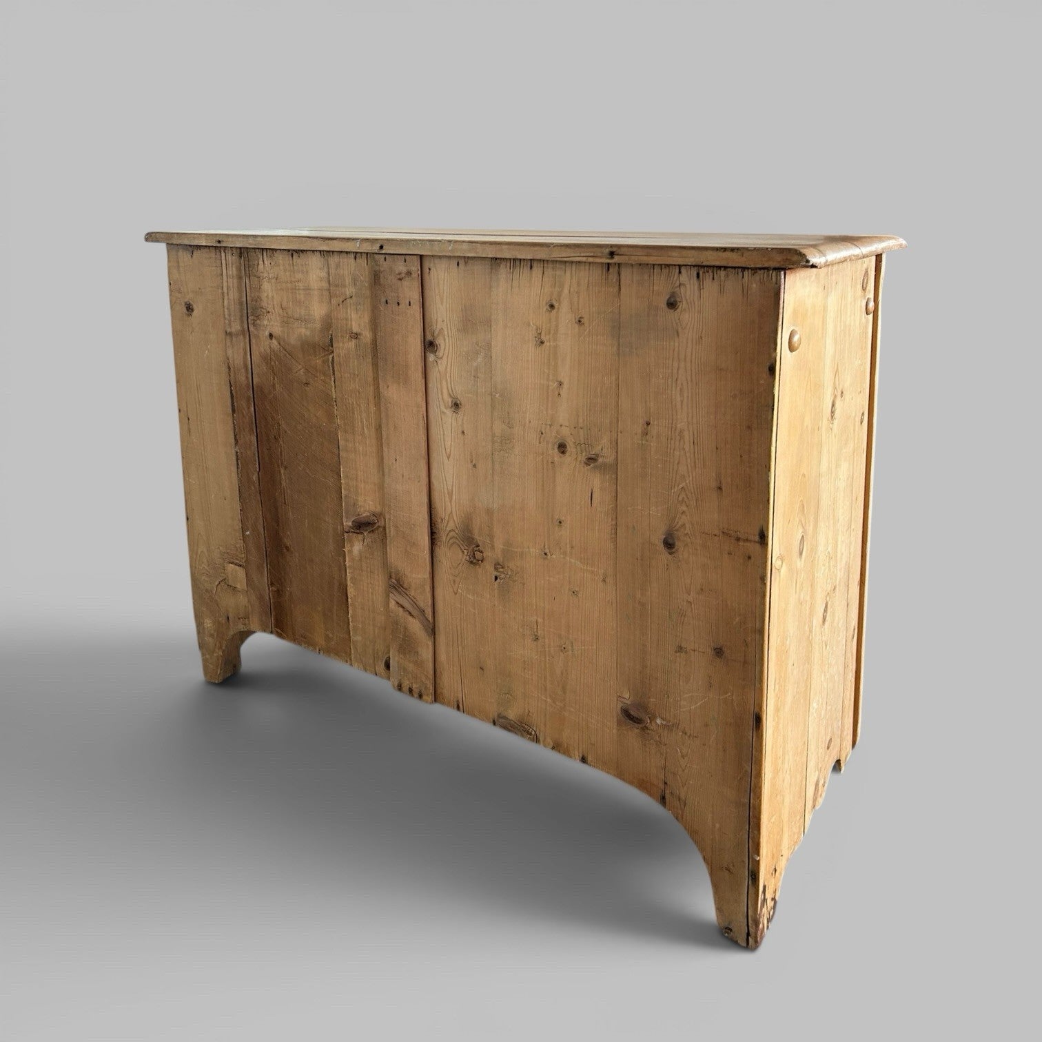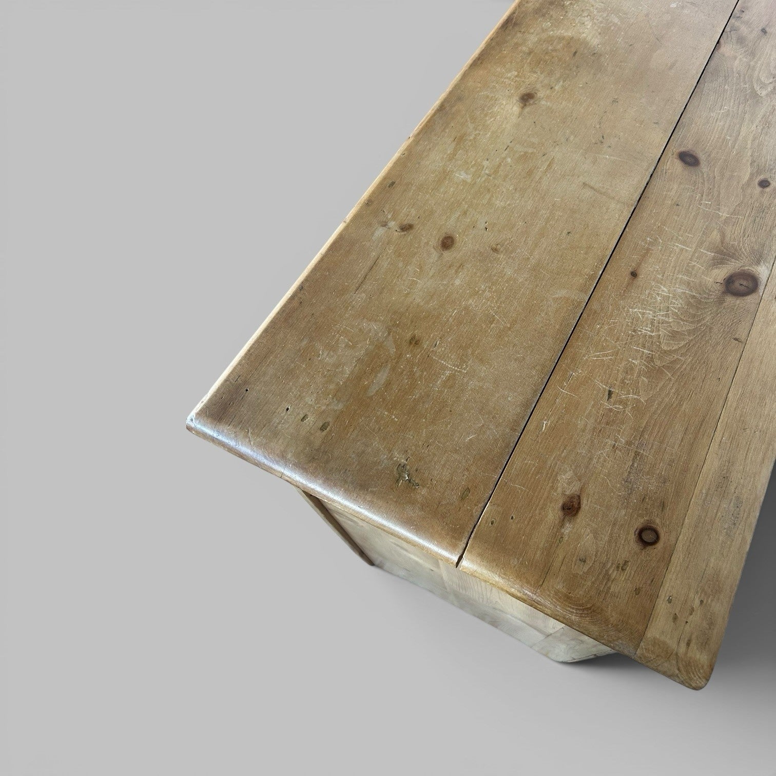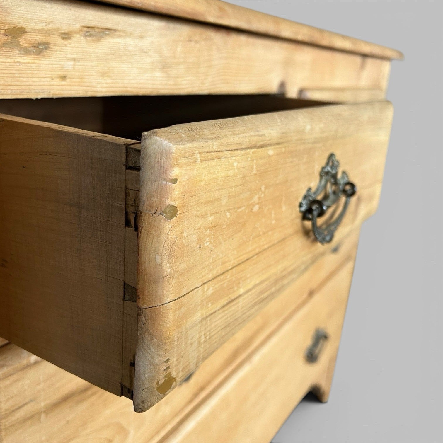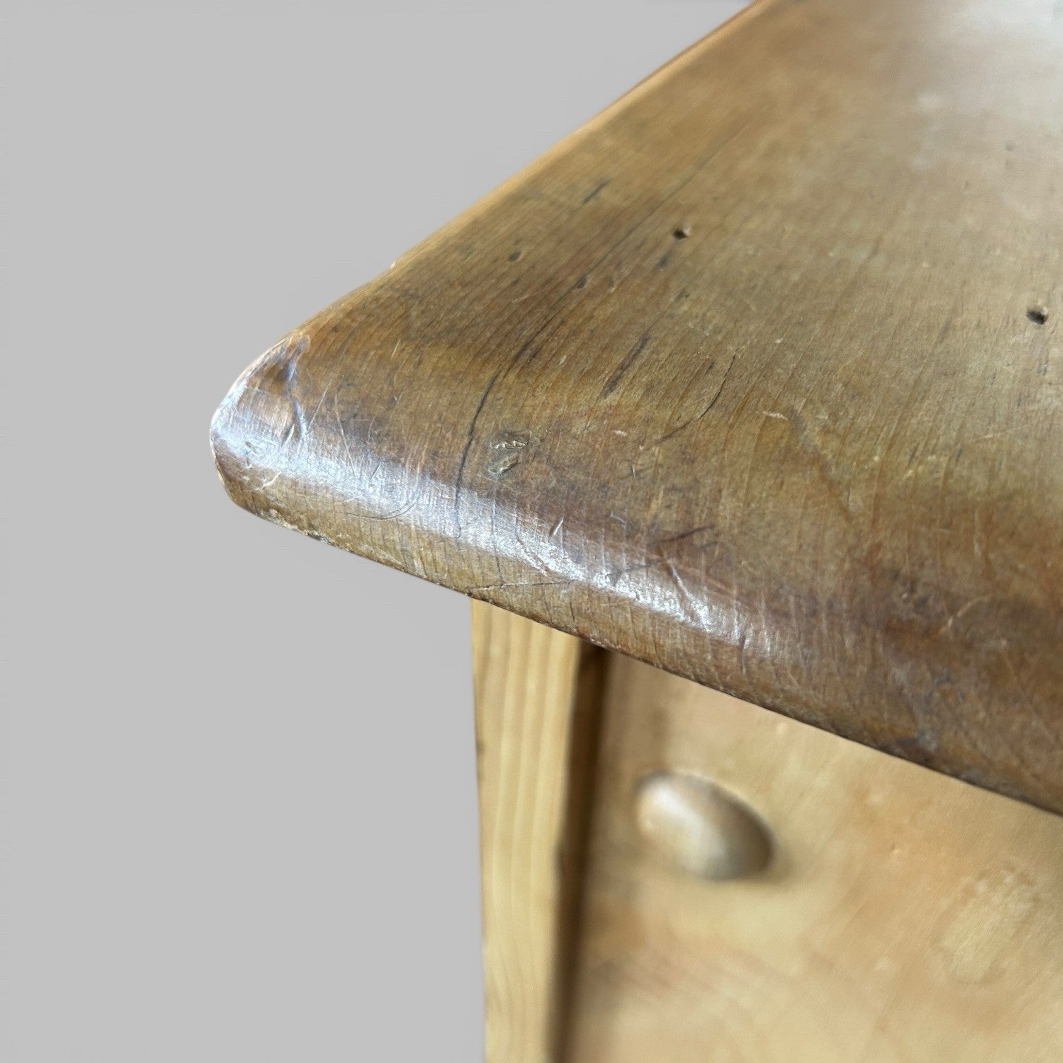 Good size for everyday storage. Drawers run as they should and the piece sits well. There are marks, knocks and wear across the top and fronts, plus some variation in colour and grain, all consistent with age. Nothing structural – just an honest, used piece.