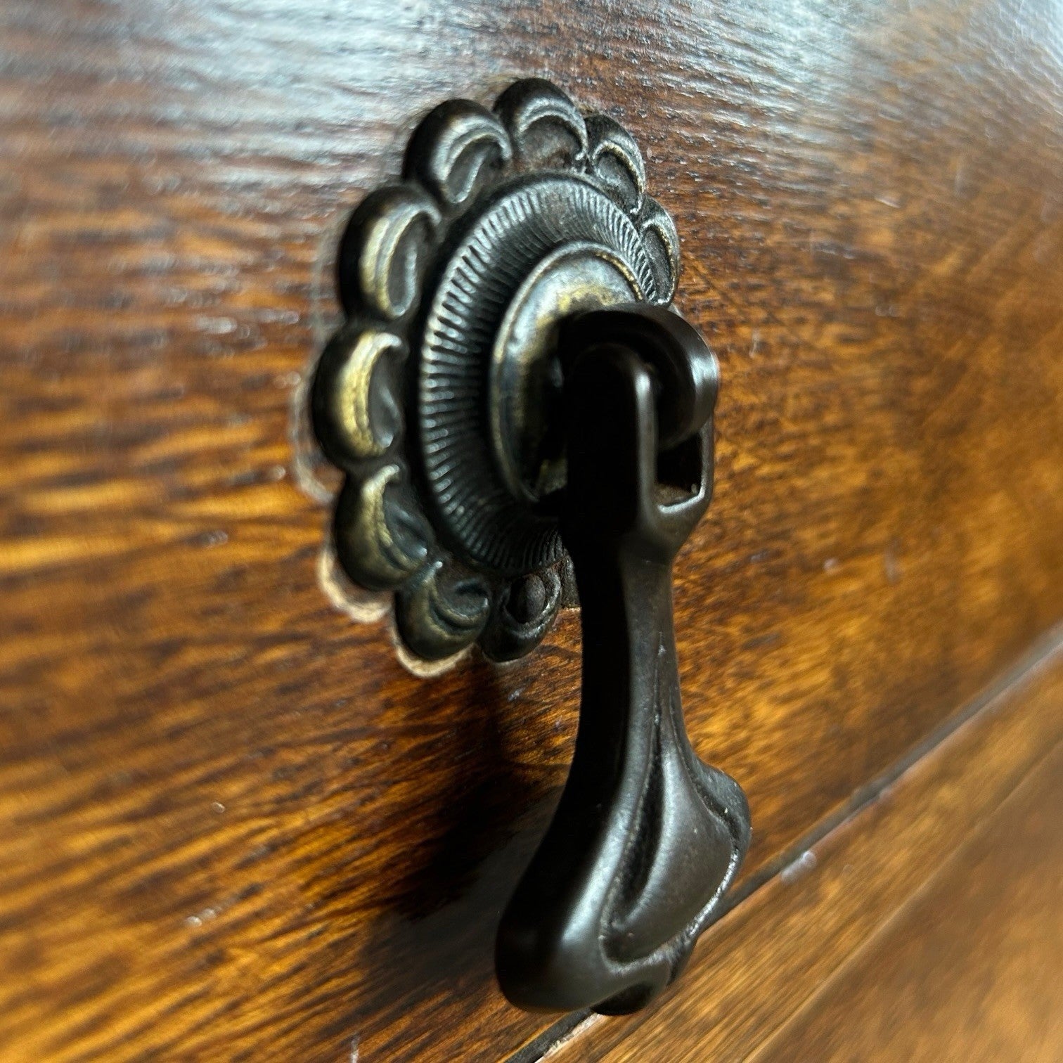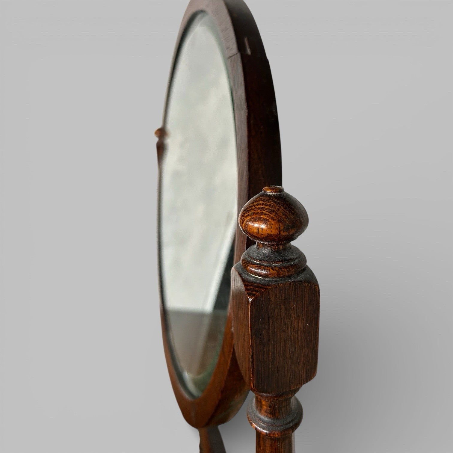 The oak has a deep, warm tone with lovely figuring through the grain, especially down the front edges. It’s been cleaned and lightly refreshed. There are signs of age as you’d expect on an honest antique piece, but nothing structural. Drawers run well, mirror tilts as it should, and it sits solid.