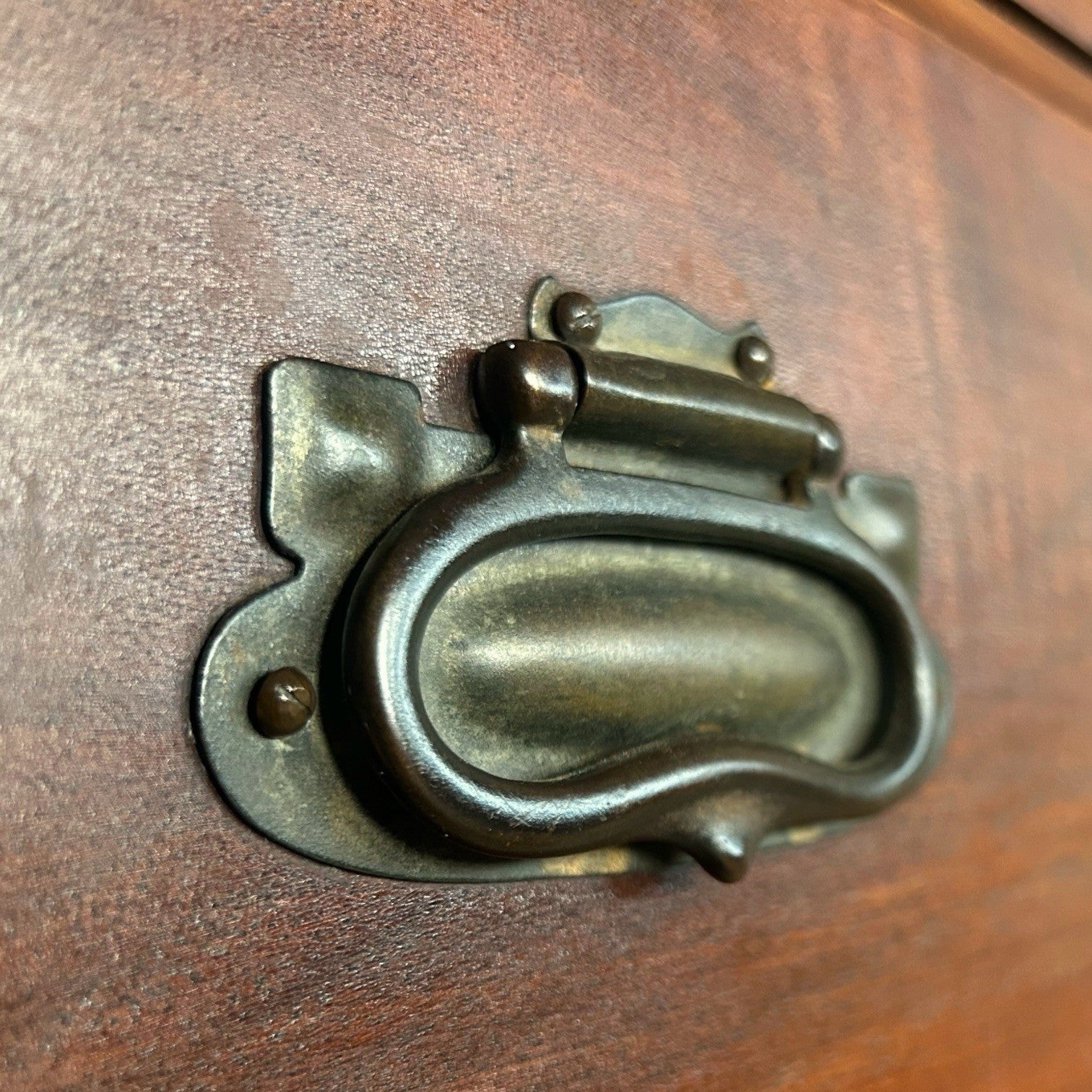 Elegant Edwardian chest of drawers in rich mahogany with original brass handles and ceramic castors. Four graduated drawers with dovetail joints, full of character and warmth. A timeless antique with refined simplicity, ideal for bedroom or hallway use.