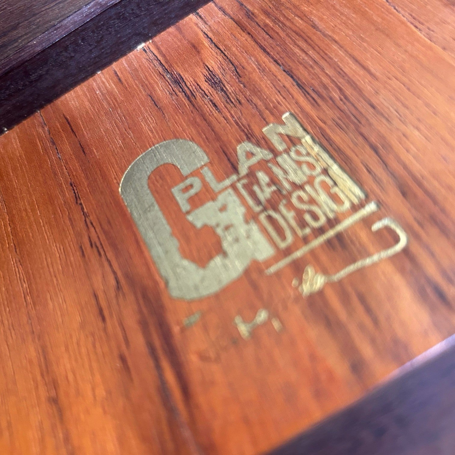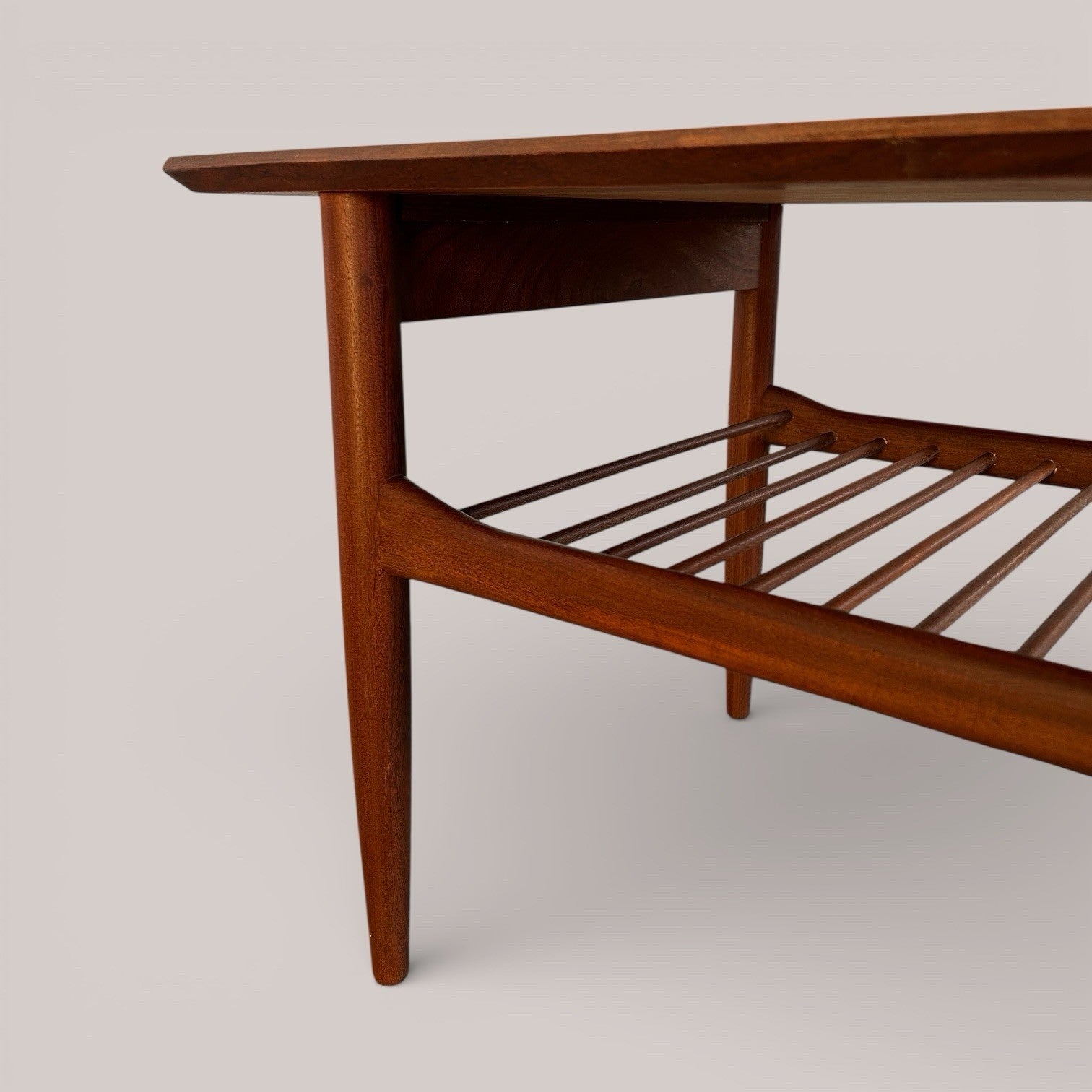 A beautifully proportioned mid-century teak side table from G Plan’s Danish Range, designed by Ib Kofod-Larsen. Featuring a slim rectangular top, gently tapered legs, and an elegant slatted magazine rack beneath, this is a classic piece that combines practicality with refined Scandinavian-inspired design.