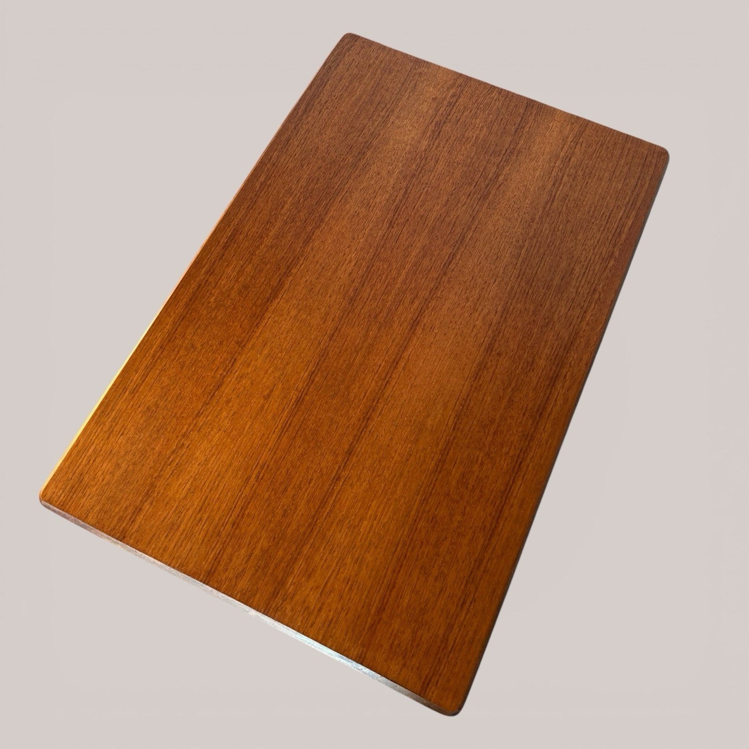 The warm teak grain and softly rounded edges give it real visual warmth, making it ideal beside a sofa or armchair. Solid, well made, and full of character, it works equally well as a lamp table, occasional table, or compact coffee table. In very good vintage condition, with only light age-related wear, consistent with careful use.