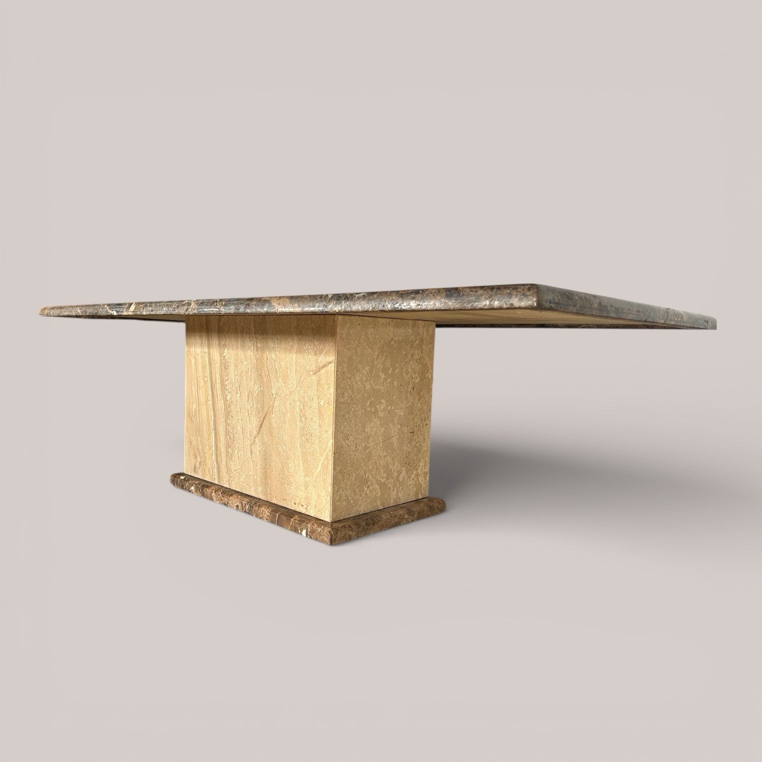A solid marble coffee table with a rectangular top and a square pedestal base, made entirely from stone. The darker marble top sits over a lighter marble column and plinth, giving it a strong, grounded look without any fuss. It’s a straightforward, architectural design where the weight and material do all the talking. Tables like this are typical of late 20th century Italian production and work particularly well as a central coffee table in a larger seating area.