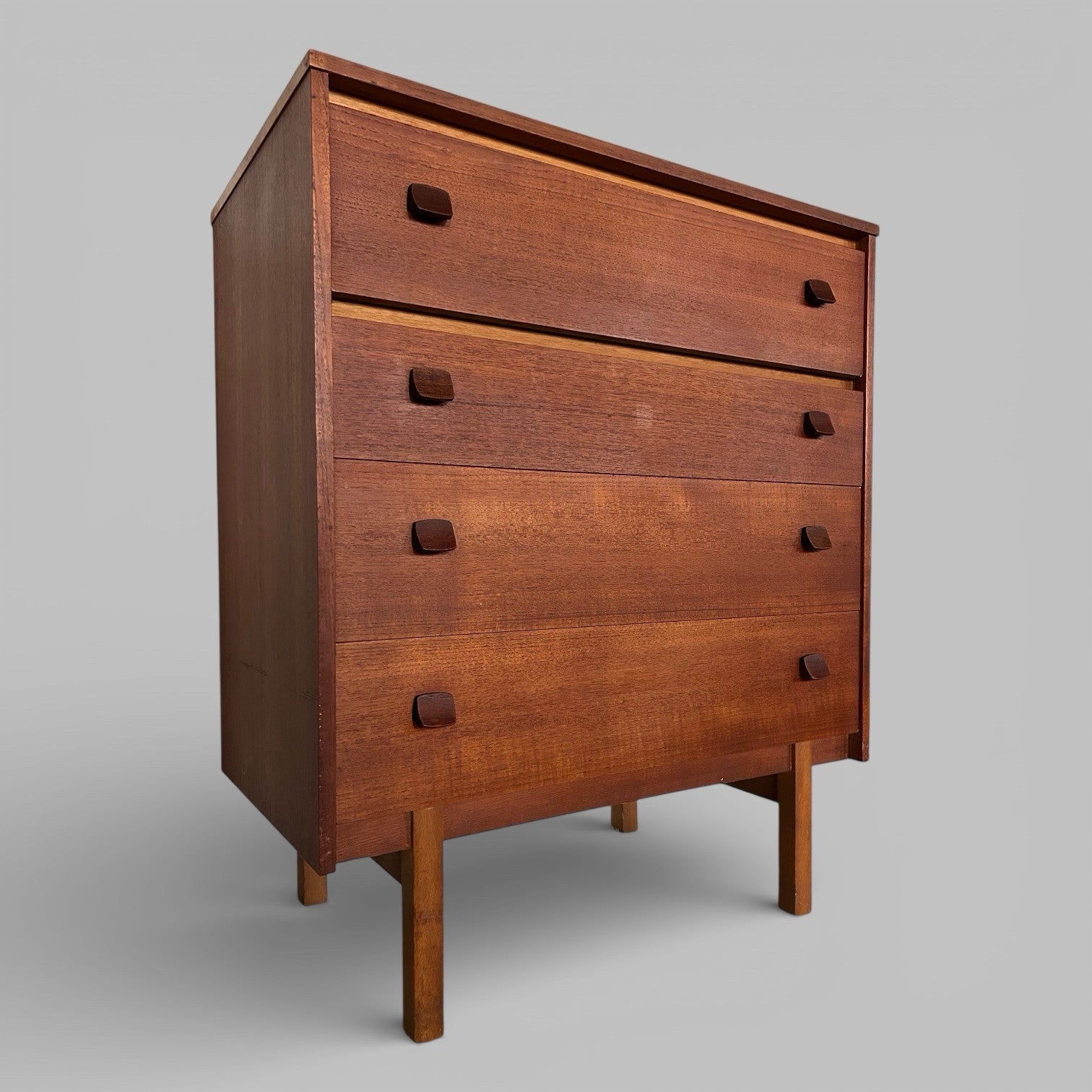 A clean, well proportioned mid century teak chest with four generous drawers and classic understated lines. Raised on solid legs with simple sculpted teak pulls, it has that calm, Scandinavian-influenced look that just works in almost any setting.