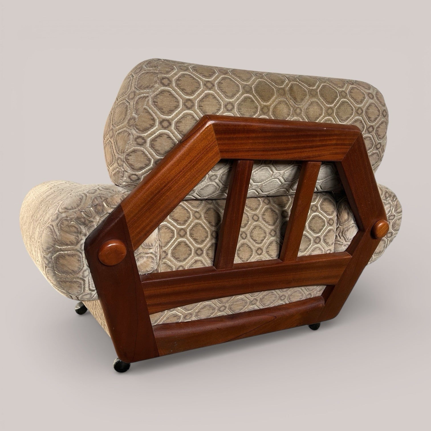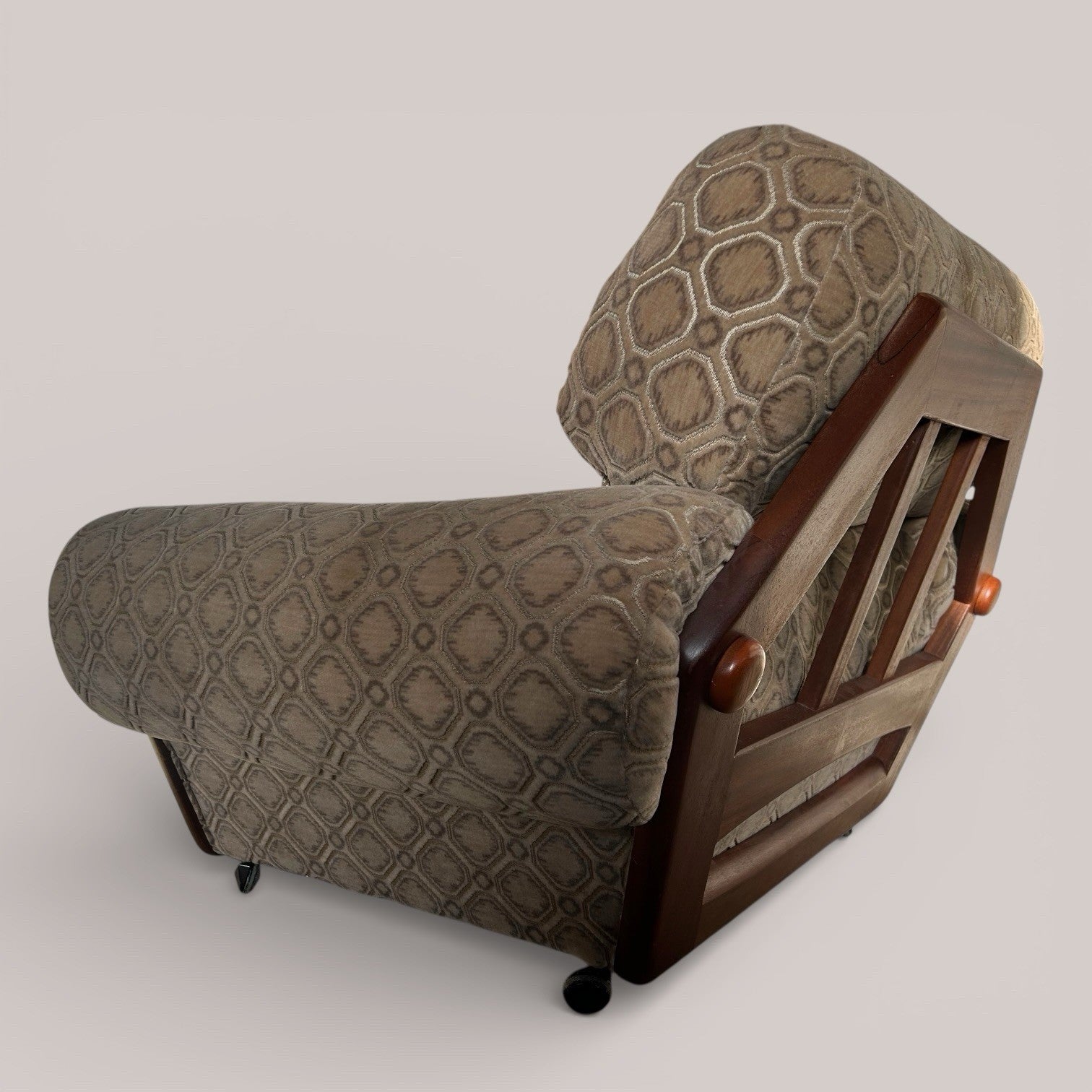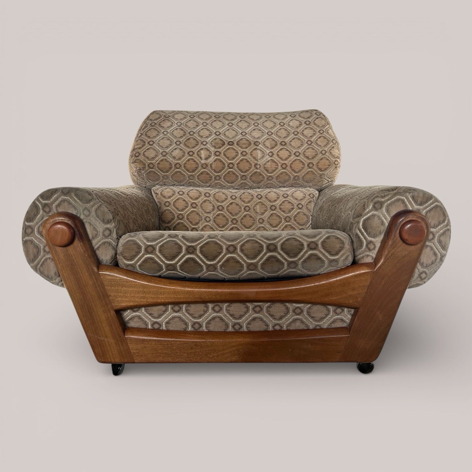 A generously proportioned mid-century armchair with a low, relaxed stance and a beautifully shaped solid teak frame. Upholstered in a soft velour fabric with an all-over geometric pattern, the chair has real presence and comfort, making it ideal as a lounge or statement reading chair.
