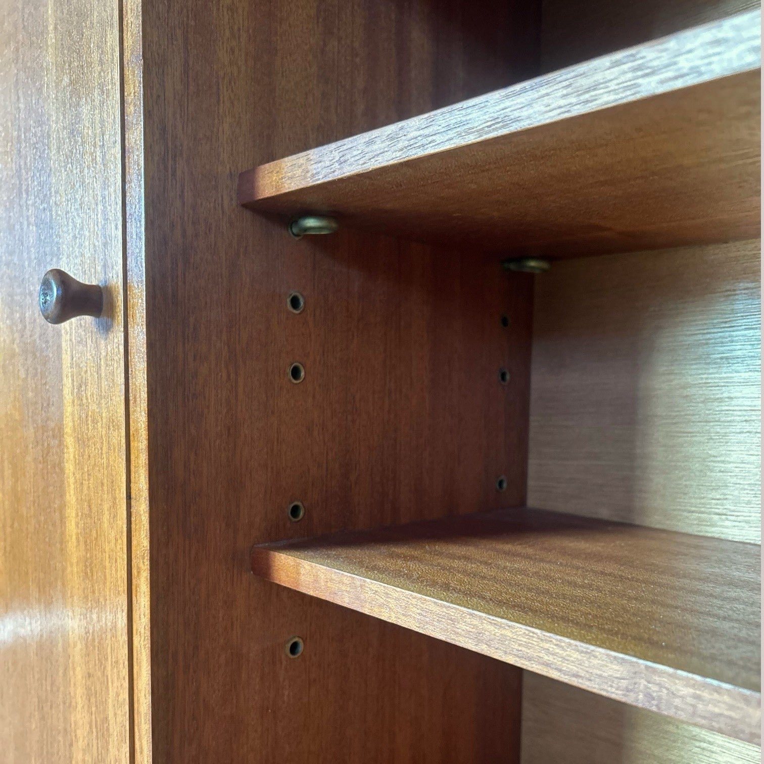 The proportions are particularly useful at just 28 cm deep – ideal for narrower rooms, hallways or behind a dining table. The teak has a warm, even tone with attractive grain throughout. Light age-related marks consistent with use, but overall well presented and structurally solid. Glass doors slide smoothly and internal shelves are adjustable.