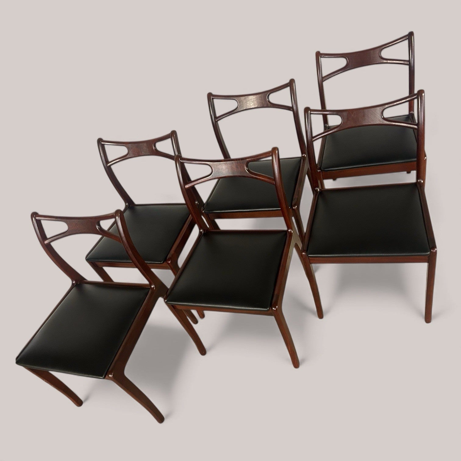 Beautiful set of six Danish style dining chairs in richly toned rosewood, newly recovered in black vinyl for a clean, modern finish. Elegant sculpted backs and slim legs give them that unmistakable Scandinavian lightness while still feeling solid and well made. A striking addition to any dining room.