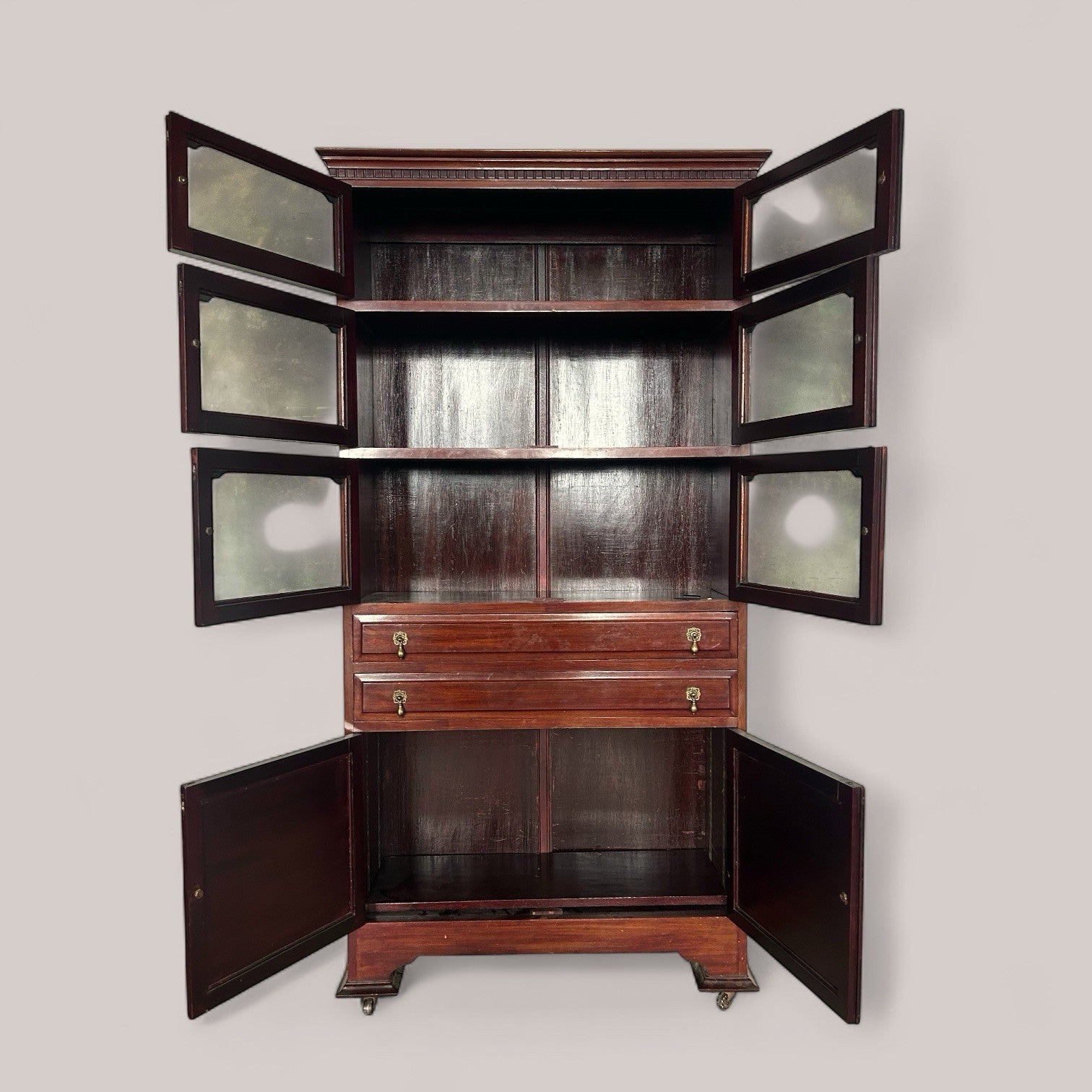 A fine Victorian mahogany display or china cabinet featuring bevelled glass doors, brass drop handles, carved lower panels, and dovetailed drawers. Perfect for use as a bookcase, drinks cabinet, or display storage.