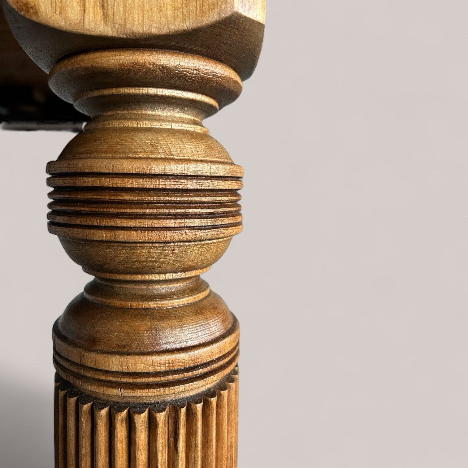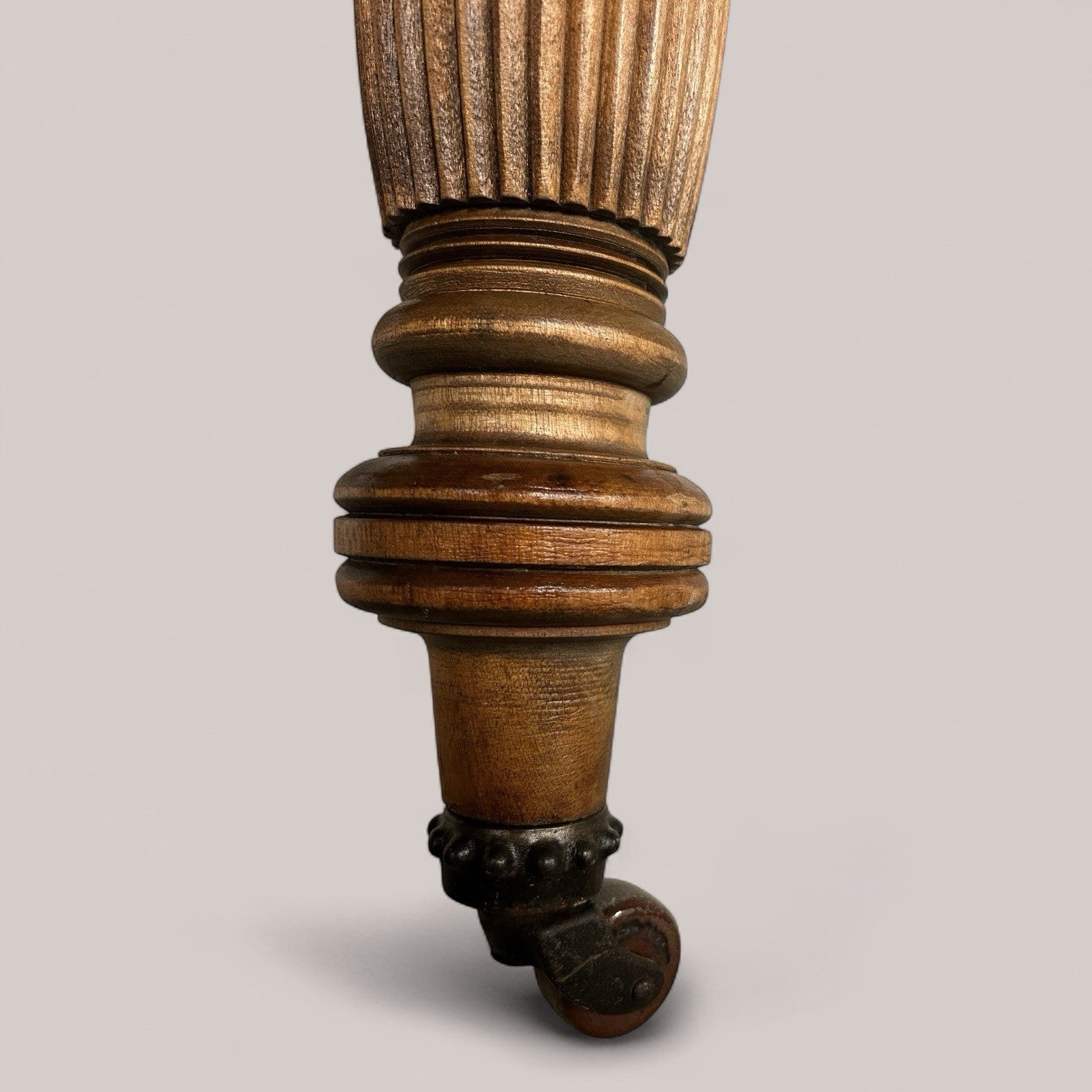 Table is solid and has a deep and rich patina, ceramic castors and beautiful turned and fluted legs. The mechanism and castors run smoothly to easily add and remove the extension leaf.