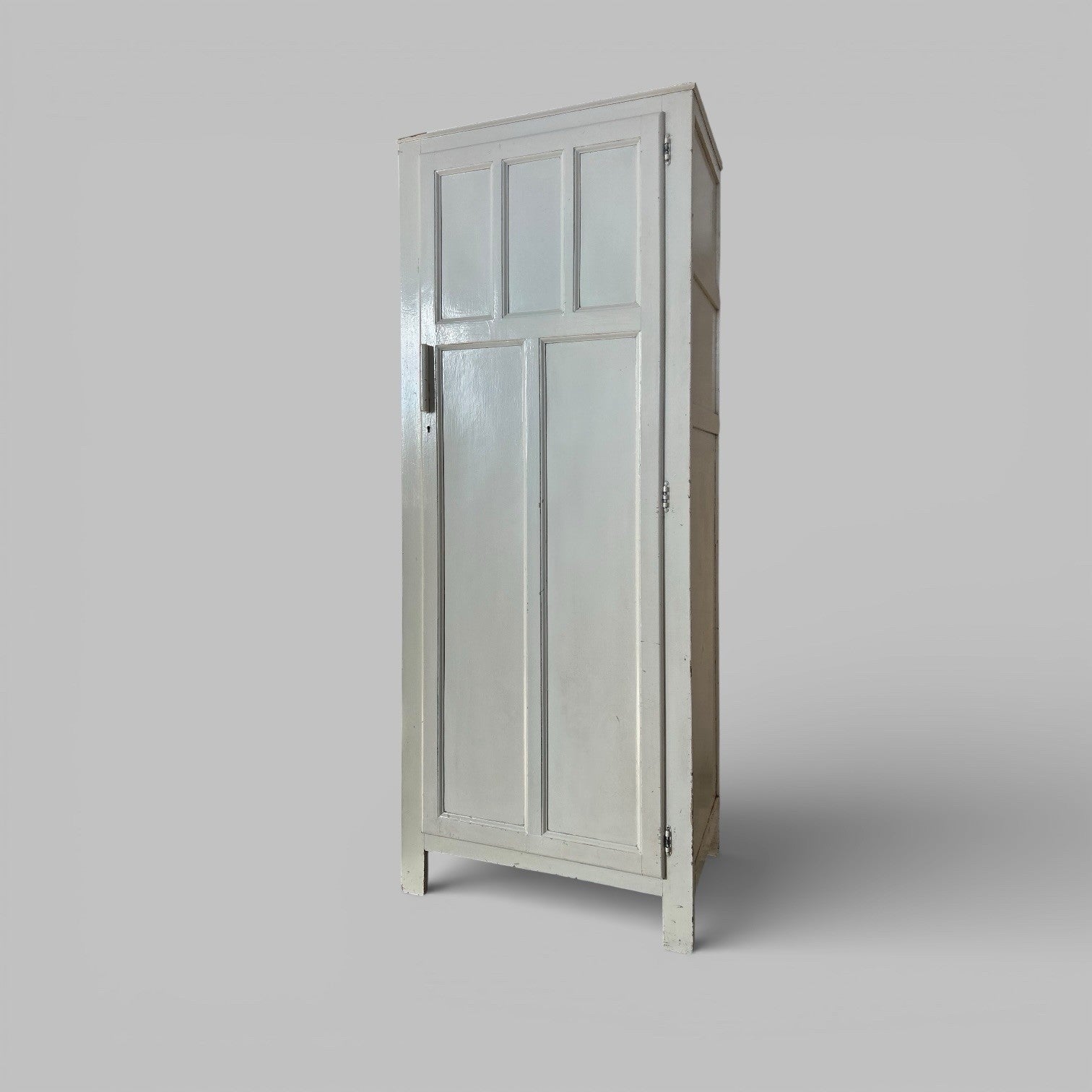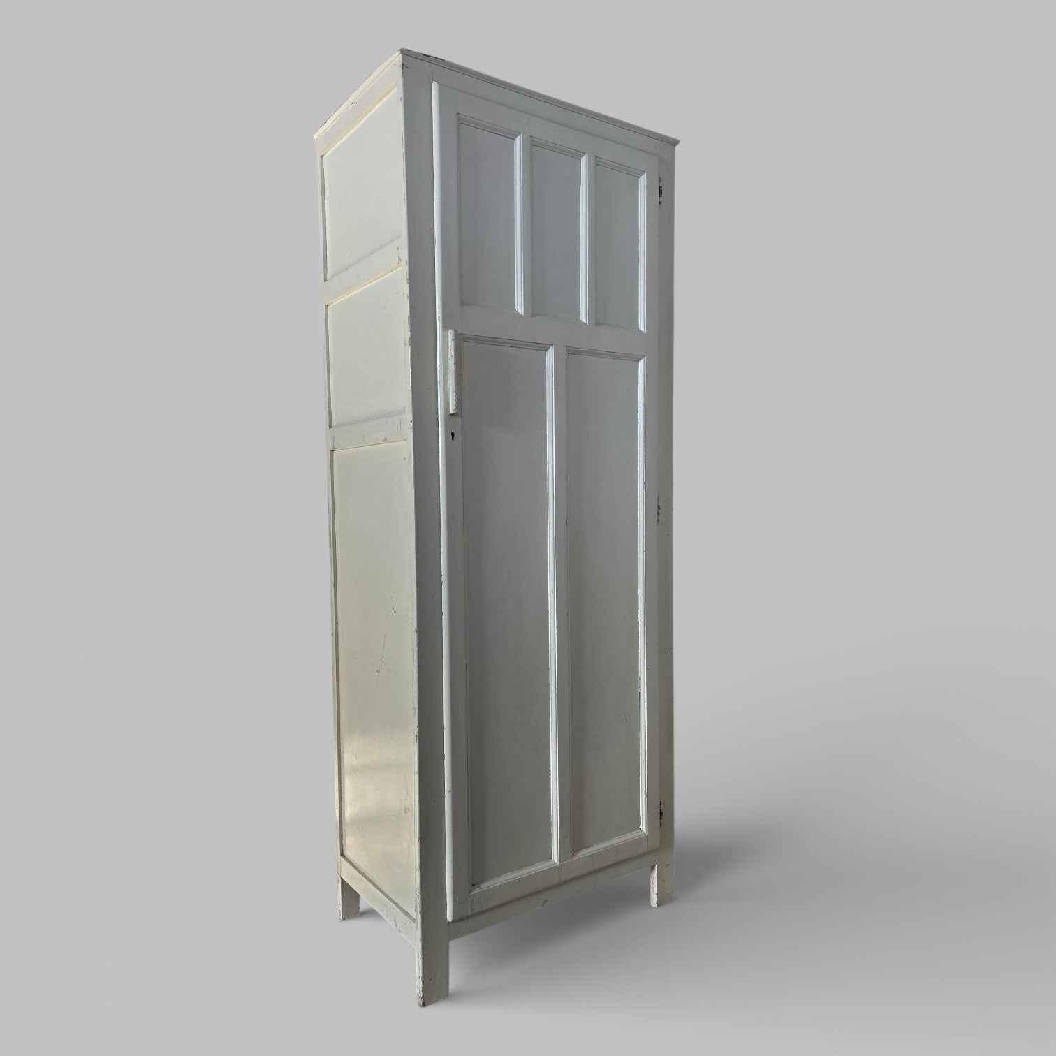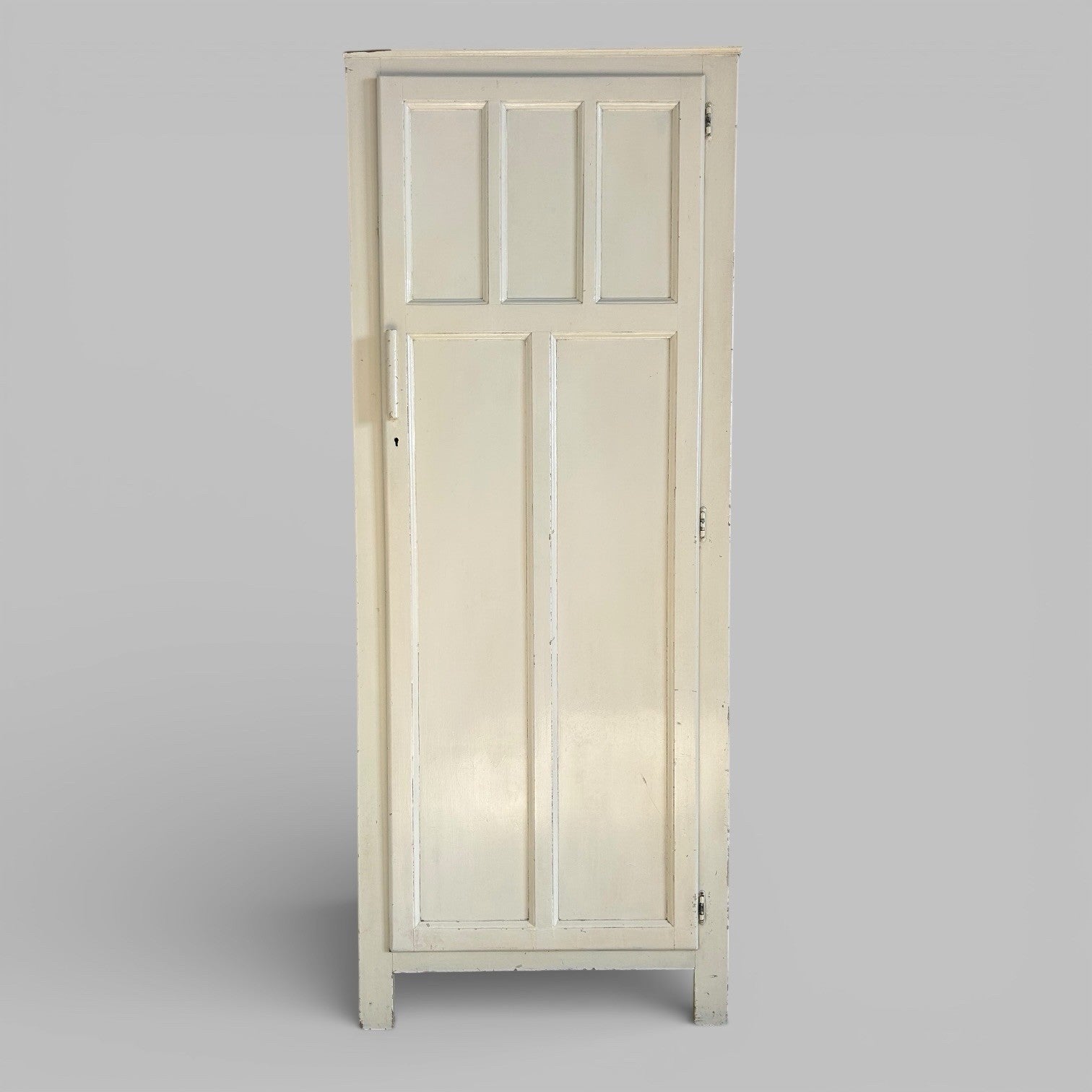 A tall, narrow painted hall cupboard with simple panelled door and clean, practical proportions. Finished in a soft off-white tone with honest age marks and wear, giving it a relaxed, understated look rather than anything overly fussy.